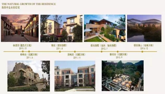 簡(jiǎn)單說(shuō)完商業(yè)的發(fā)展狀況,來(lái)說(shuō)下項目開(kāi)發(fā)的時(shí)間安排。最早的是04年白鷺郡北,這也是處于比較保守的考慮,一開(kāi)始就把最優(yōu)質(zhì)的沿山坡地資源開(kāi)發(fā)出來(lái),希望市場(chǎng)可以更早地認知到土地的價(jià)值和珍貴。之后面世的組團是竹徑茶語(yǔ),當時(shí)我們有一個(gè)口號是說(shuō)“茶園山林間的山地住宅”,整個(gè)面世的時(shí)間大概在2006年,現在良渚的宣傳資料也依然會(huì )用到一些竹徑茶語(yǔ)的形象。