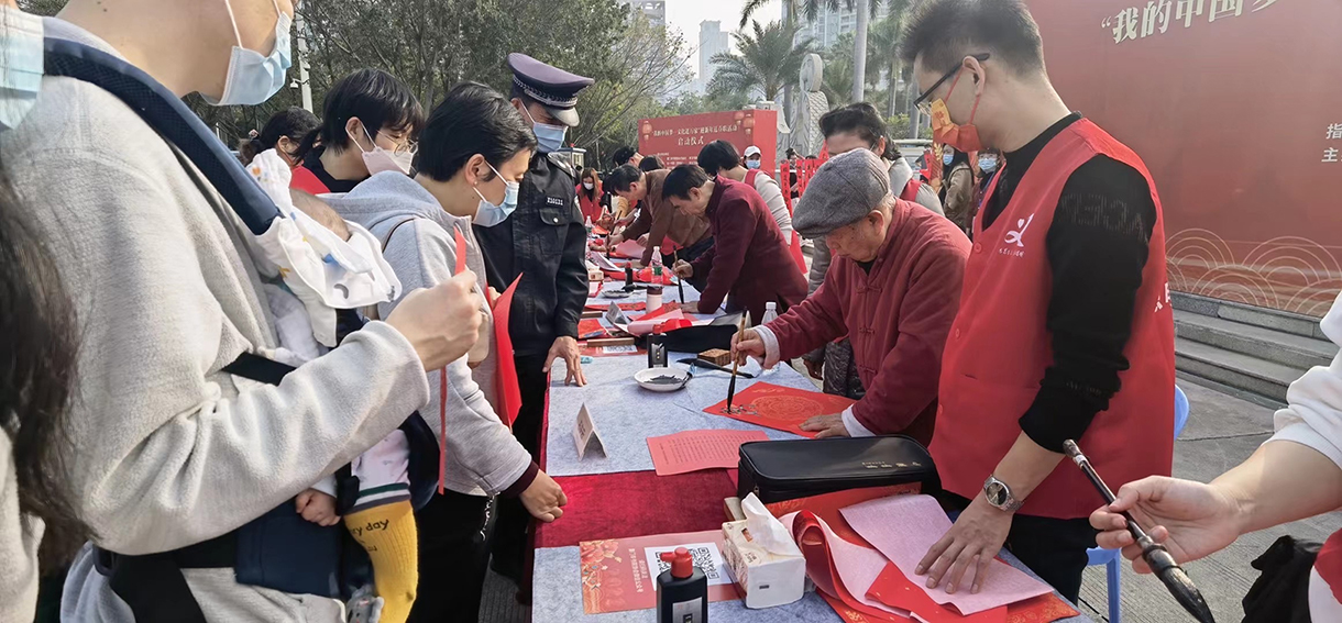 兩個(gè)小時(shí)的活動(dòng),書(shū)法家們書(shū)寫(xiě)了約500幅對聯(lián),分贈予市民?,F場(chǎng)氣氛熱烈。